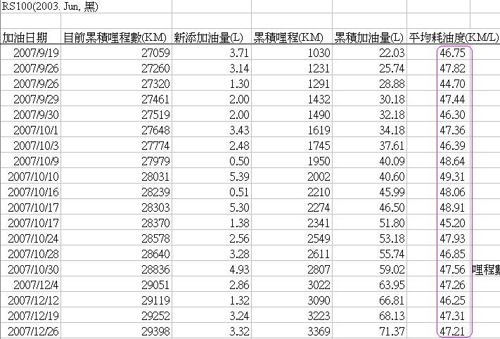 我家的 RS100/一代 (2003年份), 油耗記錄