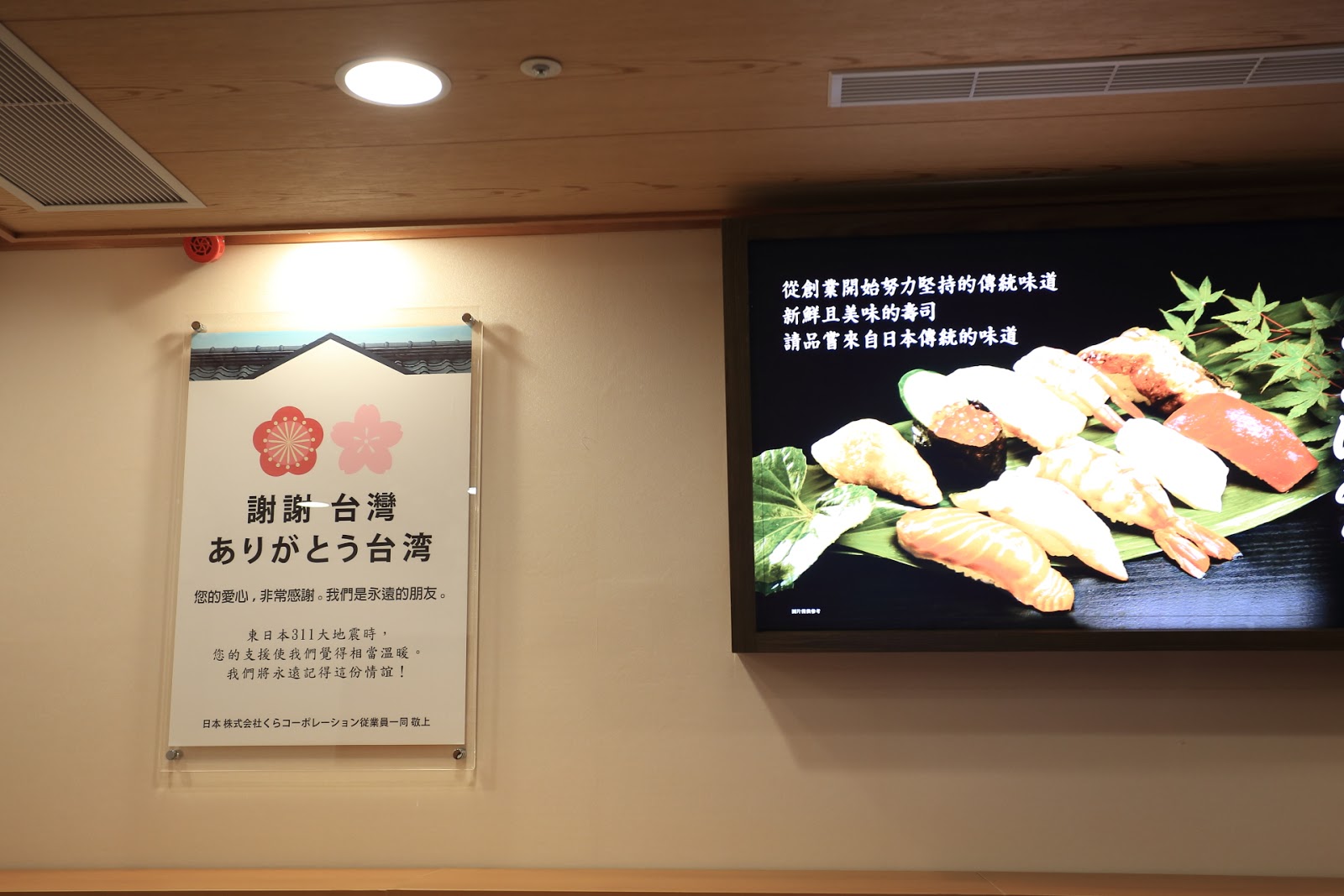 雖然餐廳是在地下室,但環境並不會感覺很悶,餐廳的裝潢很有日式風格,整體是木色系為主,店家感念台灣曾在311大地震幫忙賑災,還在結帳櫃檯後方的牆上還特地掛了一張海報。