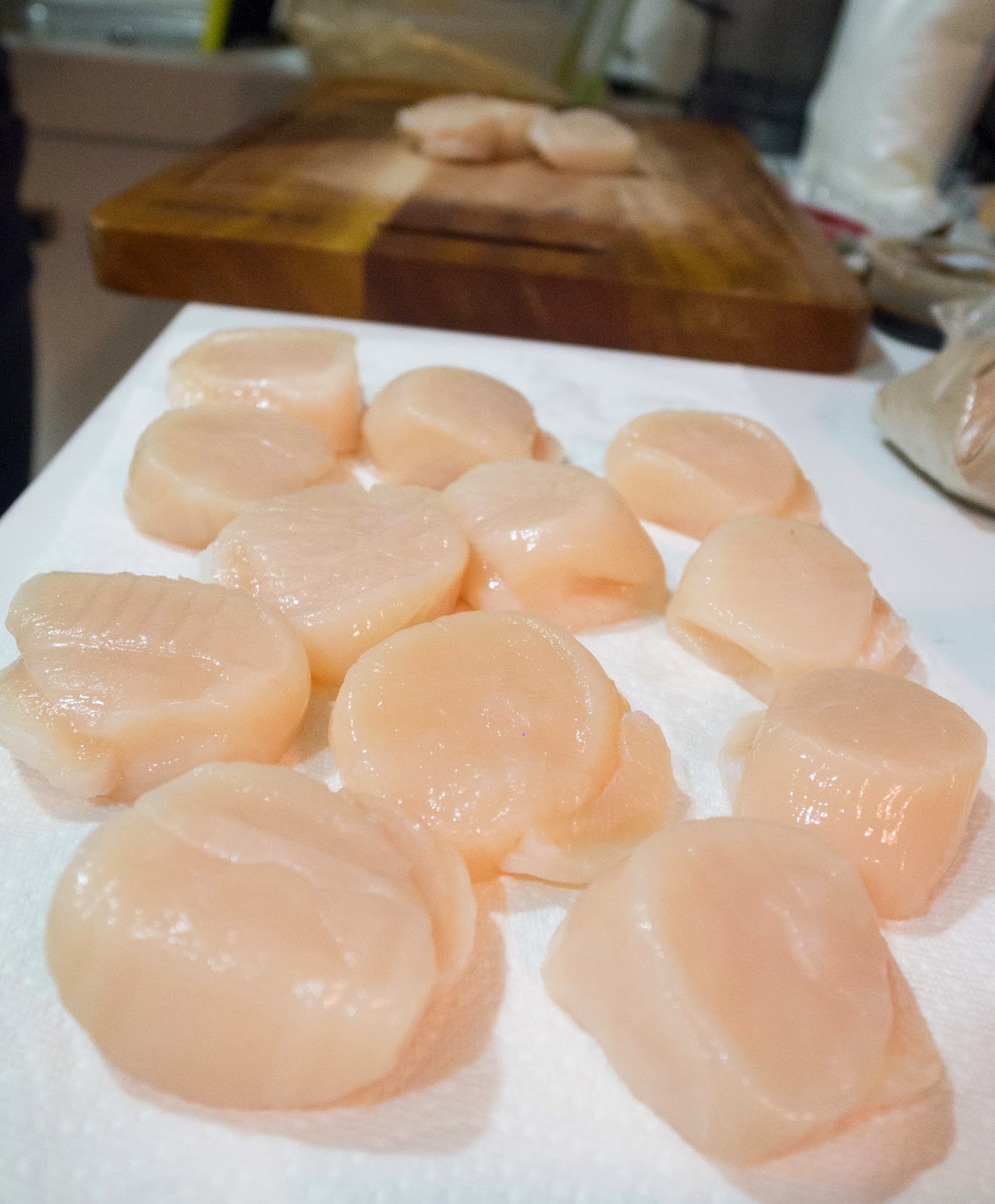 從盒子裡拿出的干貝得先拿紙巾將多餘的水分吸乾,她還向法國餐廳裡的內場廚師請益(朋友A是做外場服務),根據專業人士表示,海鮮類很適合用些許的白胡椒來進行提味;而料理干貝的方法則是在熱鍋後,趁著鍋子還沒熱到冒煙,就可以將油放進去煎干貝,兩面都上色後即可上桌。