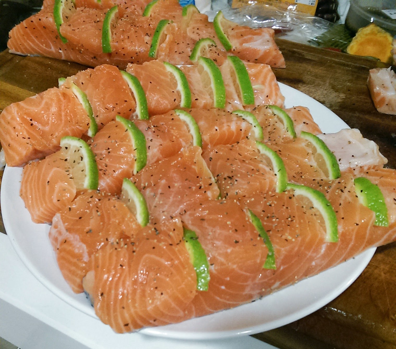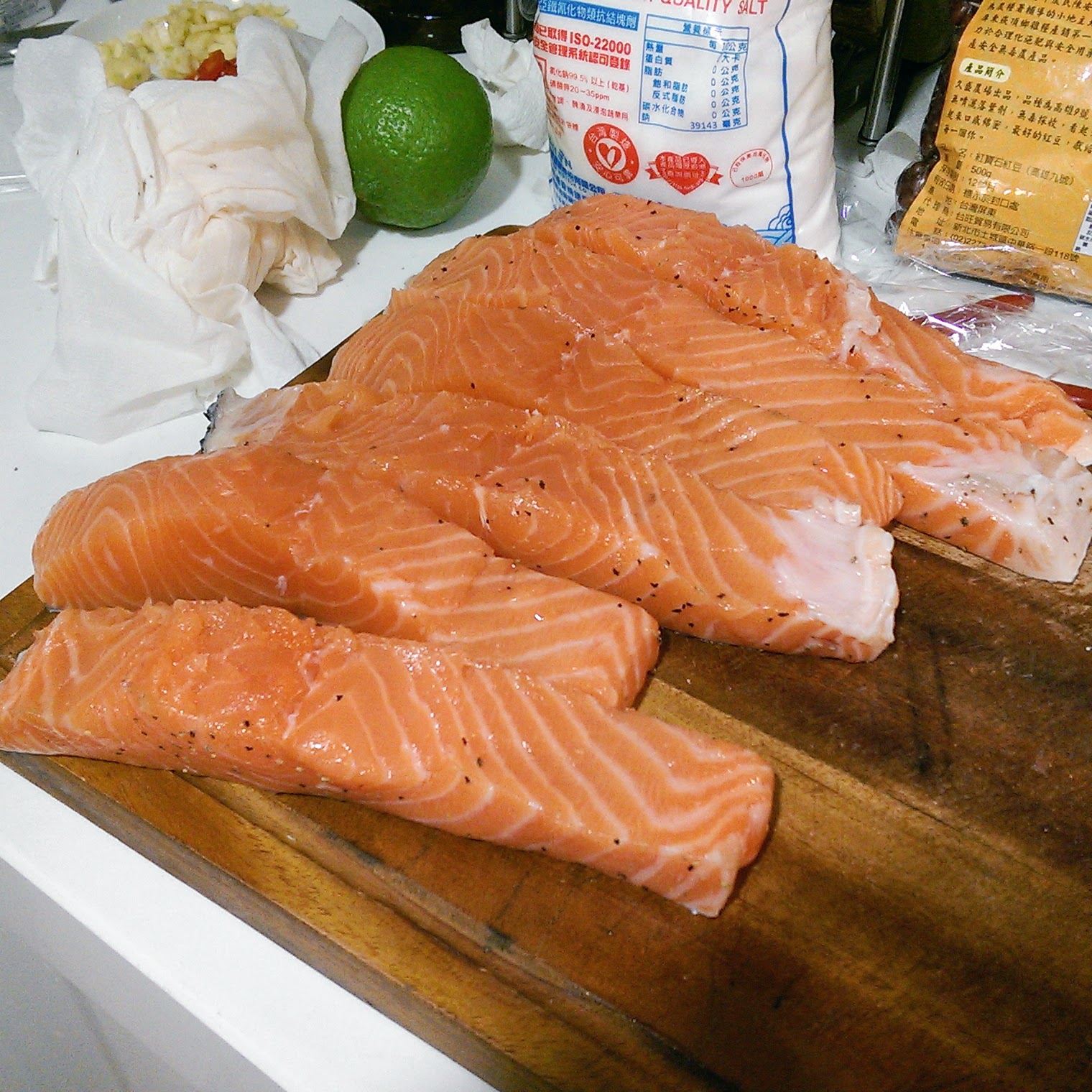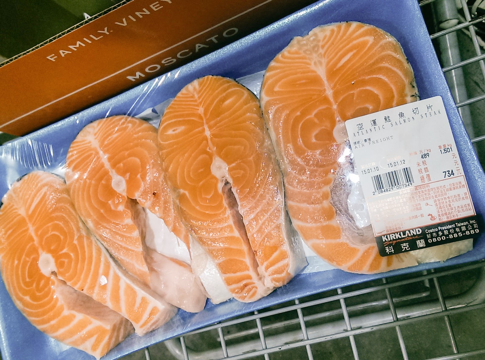 我和另一名友人負責鮭魚料理,沒時間去菜市場,只好直接殺去好市多買四大片的鮭魚排。