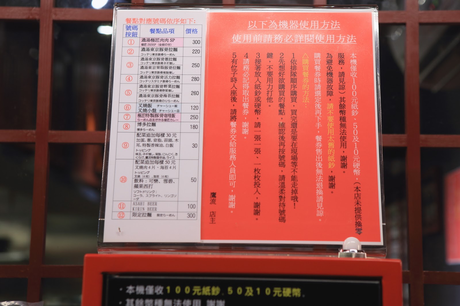 極匠採用的是日本拉麵店常見的餐卷機,先選好要吃的號碼,投入對應金額就可以取的餐卷