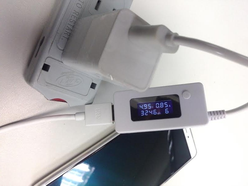 ▲ 對照組使用OPPO R7 PLUS的原廠線與原廠充電頭,可達4.95V與0.85A的充電速度。