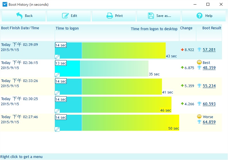 ▲ 精英LIVA X²迷你電腦連續重開機四次的時間,48到64秒都有,飄移相當大。