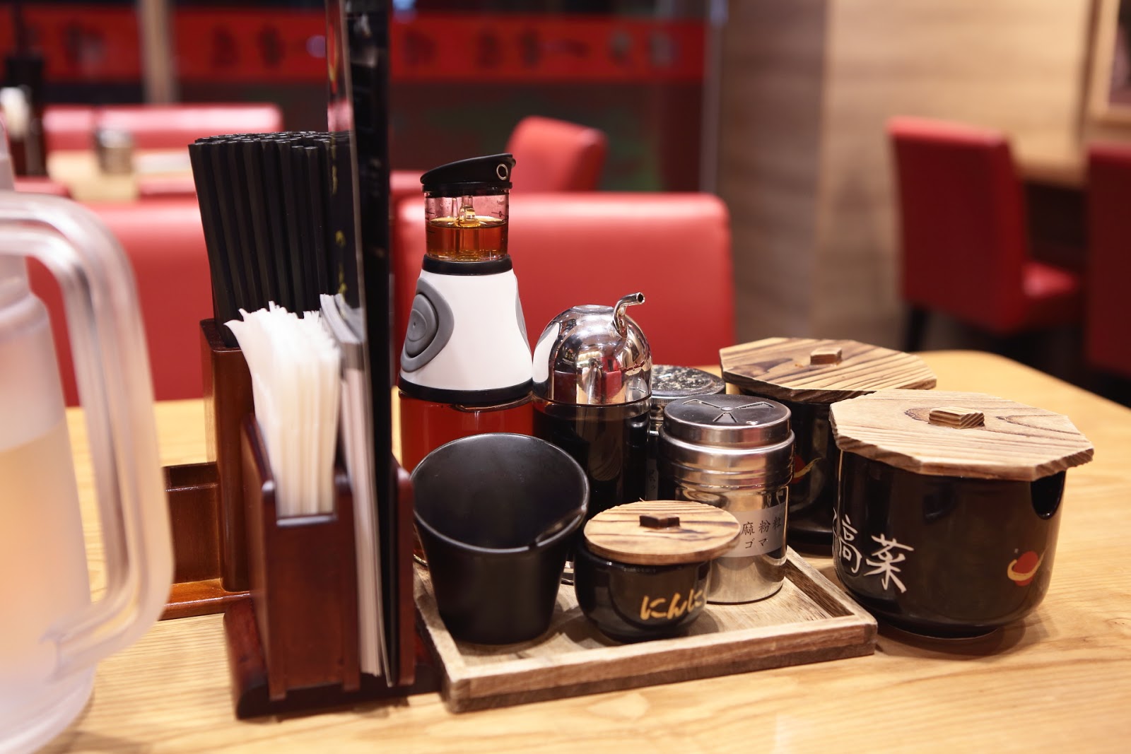 可自行添加的調味料相當豐富,有:生大蒜、芝麻、拉麵醬、辣子高菜、以及紅薑。