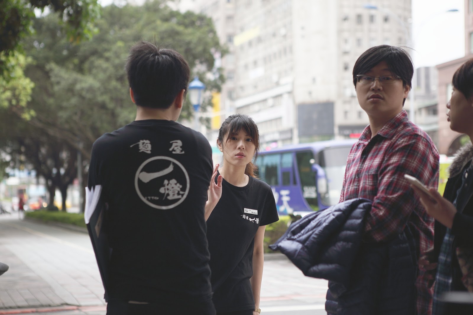 排隊到一半,會有許多店員出來引導排隊的人潮至公園,避免在騎樓的人龍過長影響到其他行人及店家,(圖中是麵屋一燈台灣店的正妹店長)