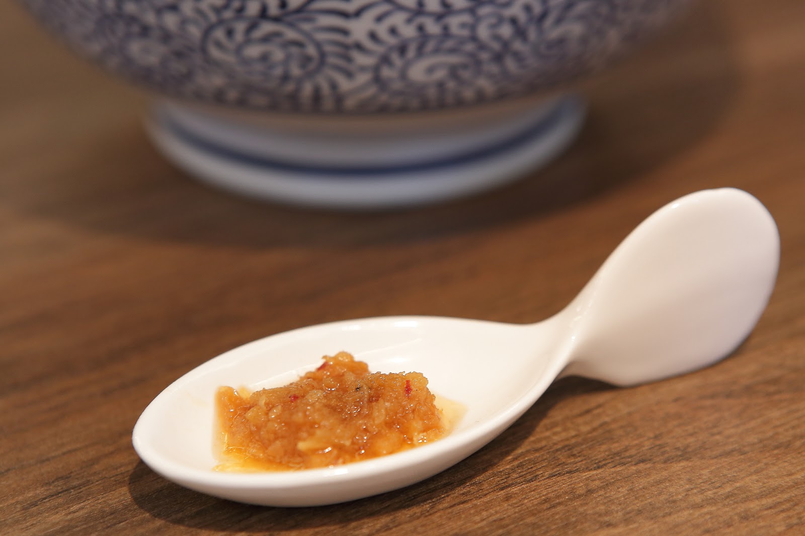 隨附的干貝櫻花蝦醬,建議是邊吃邊加入湯頭內,會讓海鮮風味大幅提升,全部加入之後,湯頭會充滿乾物類的獨特鮮味,雞湯的滋味似乎就變得不是這麼明顯了。