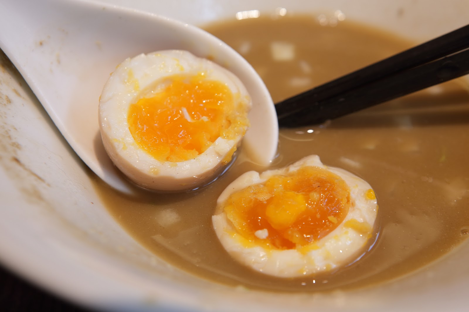 溏心蛋有兩種可以選擇,酒味蛋以及一般的溏心蛋,如果選擇酒味蛋則是整顆的不會對切 ,據說是為了怕裡面充滿酒味的蛋液流出影響到湯頭的風味,聞起來有淡淡的酒香,而一用筷子挾開,烈酒的風味只能用迸裂而出來形容,相當強烈的酒香氣,甚至可以感受到一些酒精濃度,酒量不好的人可能會臉紅紅喔。