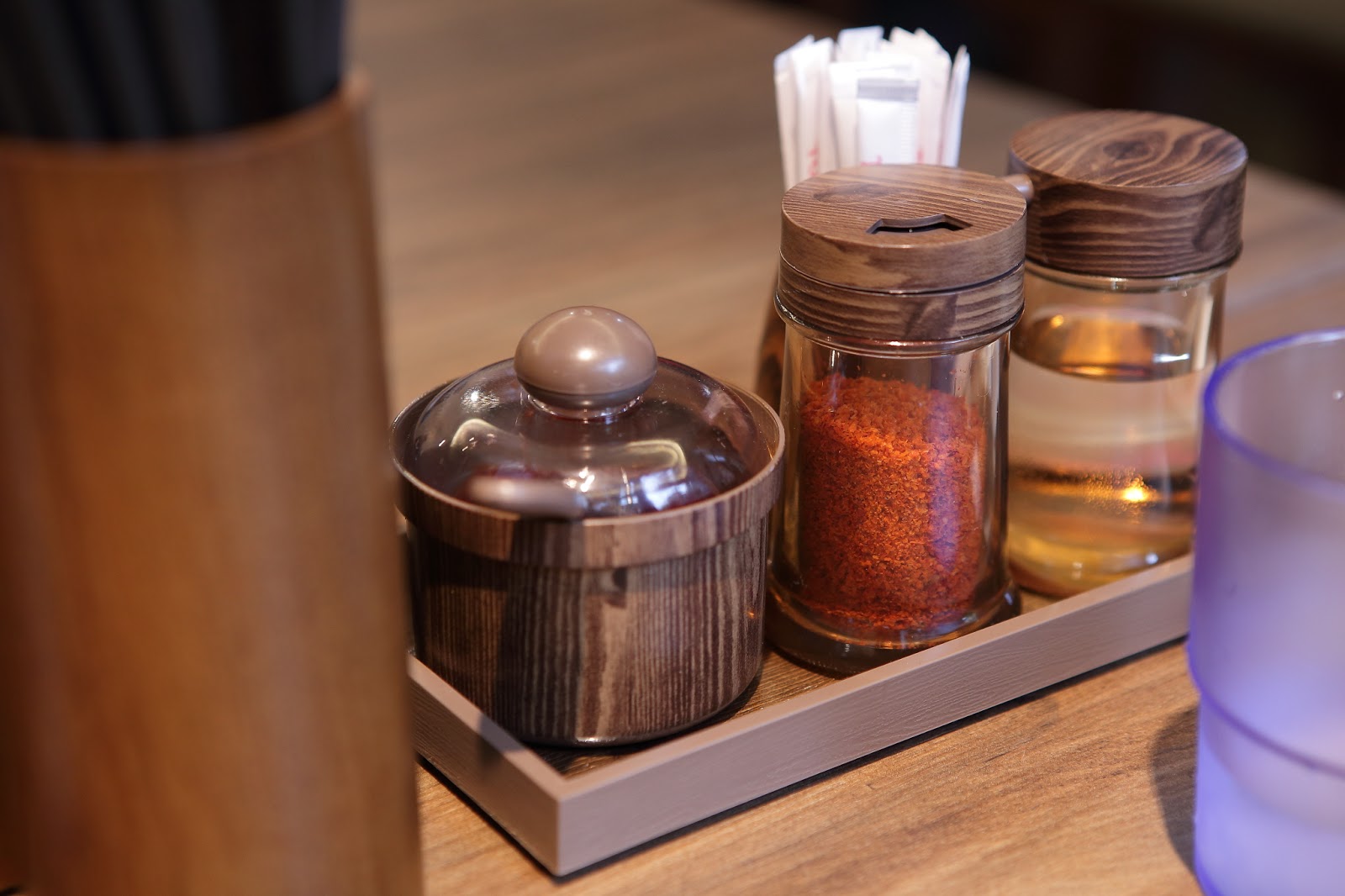 桌上有著調味料,看起來是辣油、辣粉、與醋,看起來的樣子不像市售成品,可能是店家獨有的,這點沒有特別詢問,下次補上。