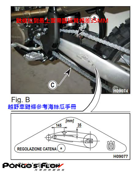 調整完重新確認鏈條的鬆緊度,因為這台車的目標是越野和林道,所以鏈條要比一般街車還要鬆。如果觀看這個教學的朋友,請務必調整到正確值唷。