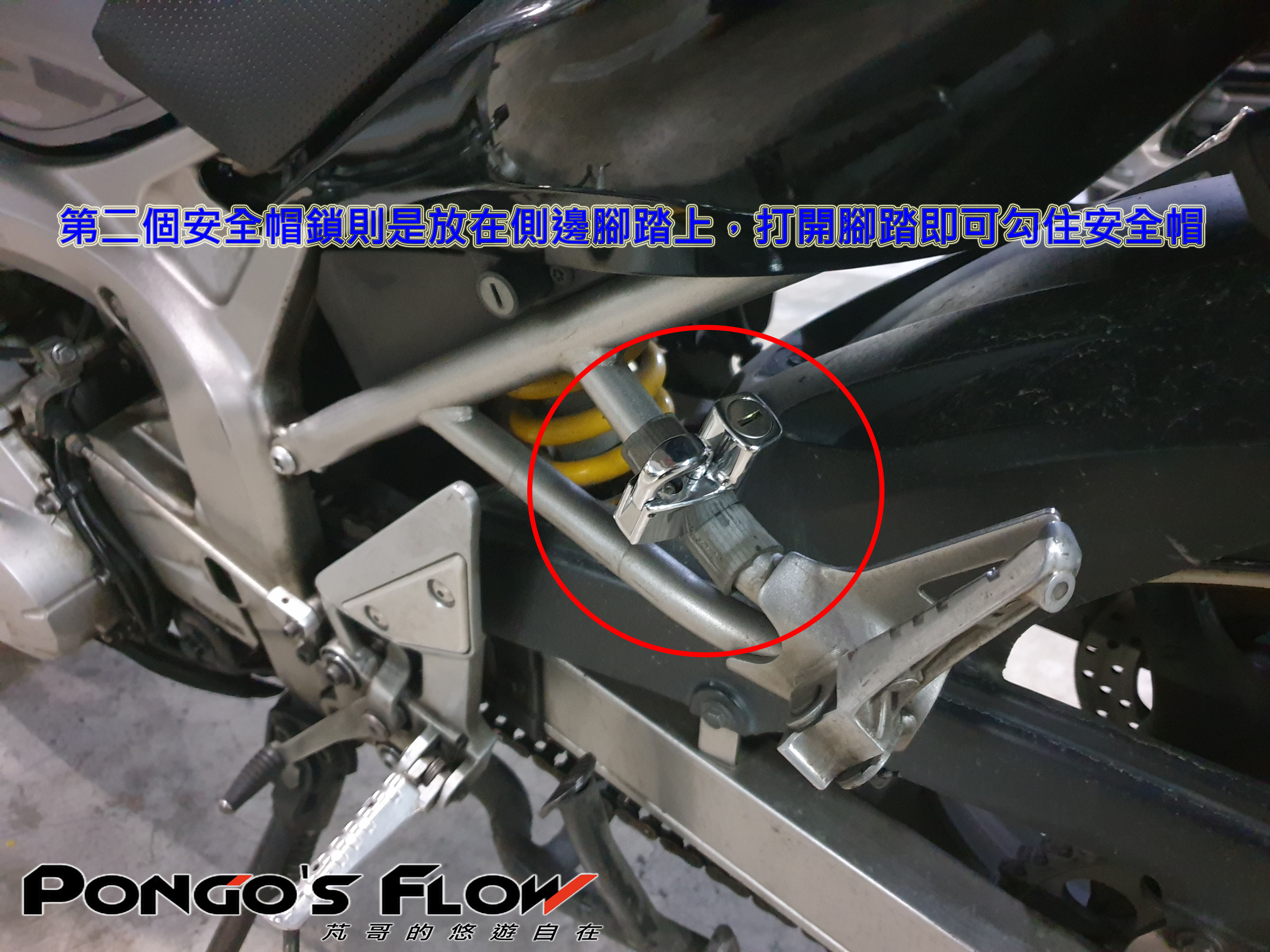 安全帽鎖的安裝位置我選擇一個在車手把處,這樣單人騎乘時就可以直接將安全帽放在油箱上面 而第二個安全帽鎖的位置則選在左側後腳踏,使用時只需要將後腳踏打開,就能幫助固定好安全帽,這個位置經過我七年的實際測試,是很方便且快速的。