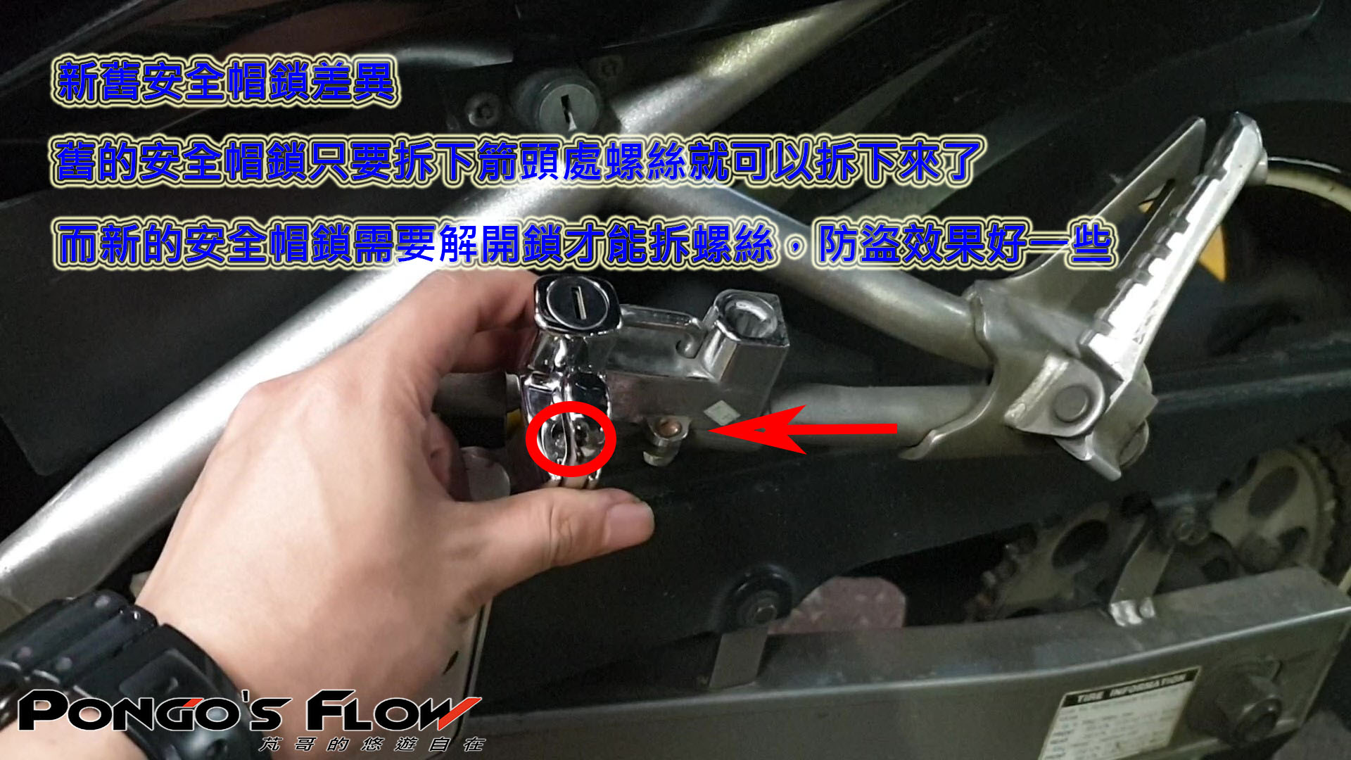 新安全帽鎖的固定螺絲設計在鎖扣內,不像舊的只需要破解紅箭頭處螺絲就可以把整個安全帽拿走了。