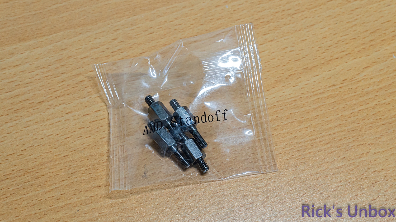 接著將上面配件介紹到的AMD螺柱鎖上4個孔位,這邊要注意的點是螺柱兩端的螺紋跟粗細不同,較粗的端面要固定在主機板的背板上,較細的端面則是跟水冷頭的螺母進行水冷的固定。